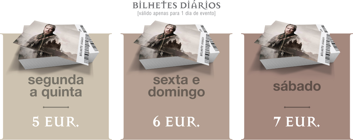 › O bilhete diário é válido, apenas, para uma entrada no recinto em dia pré-definido aquando da compra, não permitindo reentradas no evento. A organização reserva-se ao direito de solicitar documento de identificação do visitante.