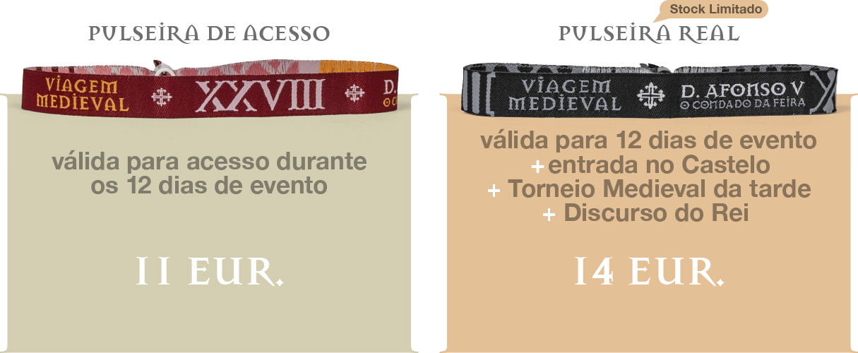 2)Torneio Medieval da tarde – levantamento, obrigatório, do bilhete gratuito numa das bilheteiras internas do evento até, no limite, 30 minutos antes de cada sessão, sujeito à disponibilidade de lotação, com apresentação da Pulseira Real devidamente colocada no pulso.
